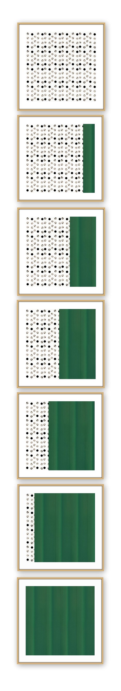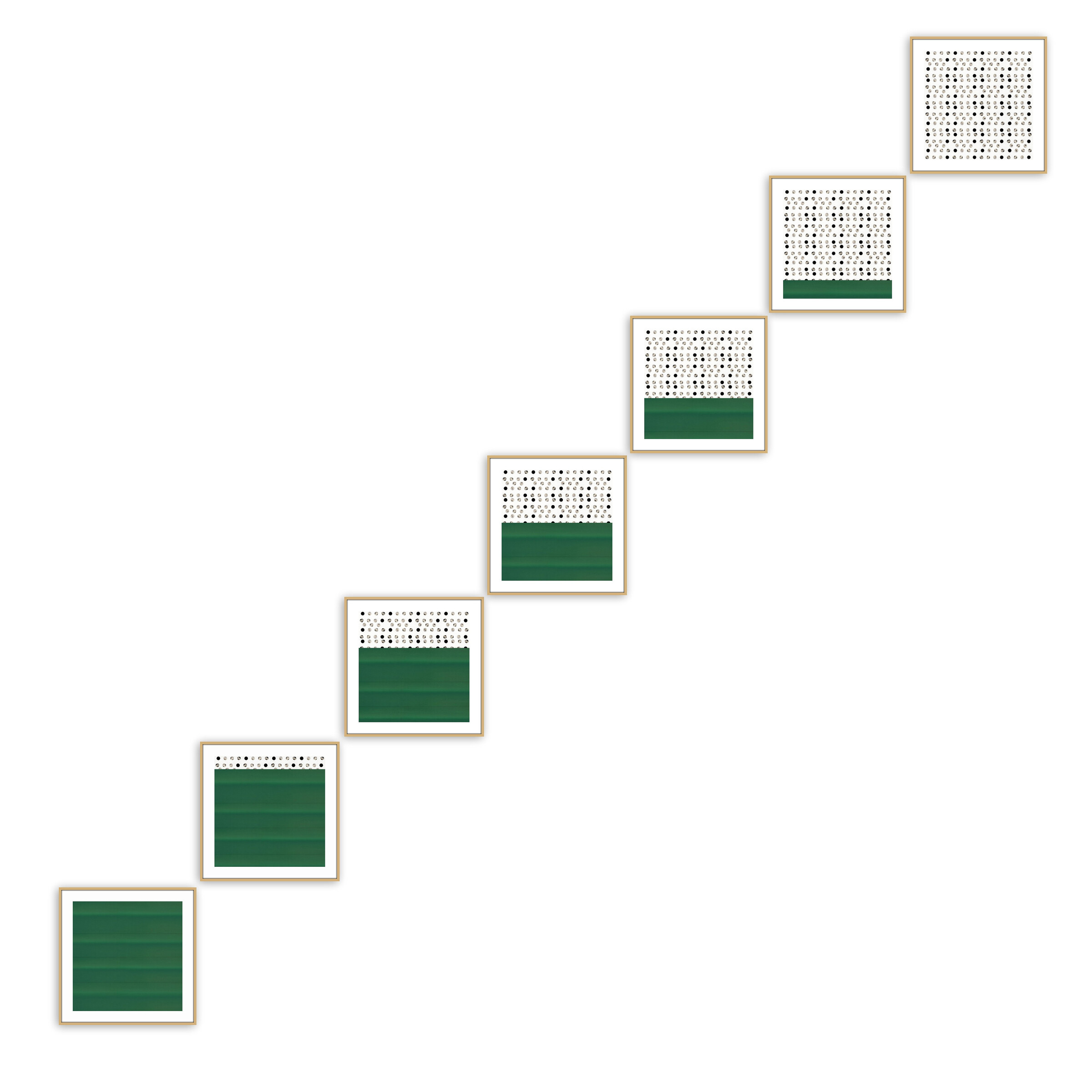 Ein grünes Werkstatttor in Nizza bildet die Grundlage dieser Serie. Aus dem Tor und einer Reihe verstopfter Luftlöcher wurden zwei Fragmente extrahiert und als eigenständige Module weiterentwickelt. Diese Elemente wurden anschließend überlagert, verschoben und in ihrer Größe variiert, sodass unterschiedliche Grünanteile sichtbar werden.